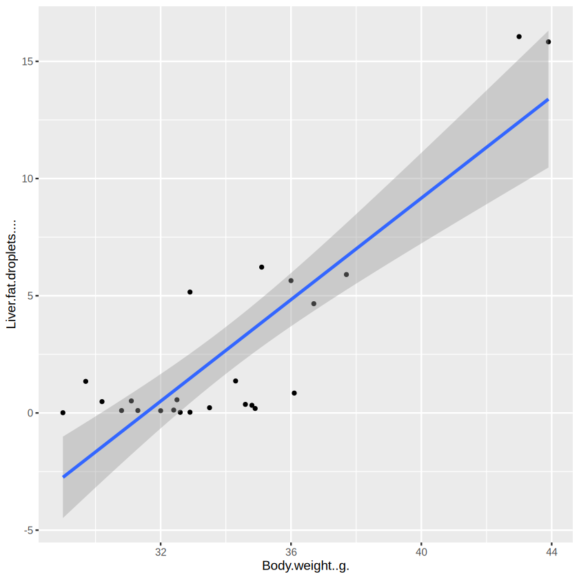 The body weight and proportion of liver fat droplets shows a strong positive correlation (Spearman’s rho = 0.8637, p < 0.001). Let’s visualize their relationship use ggplot2 to have a scatter plot with a fitted straight line.