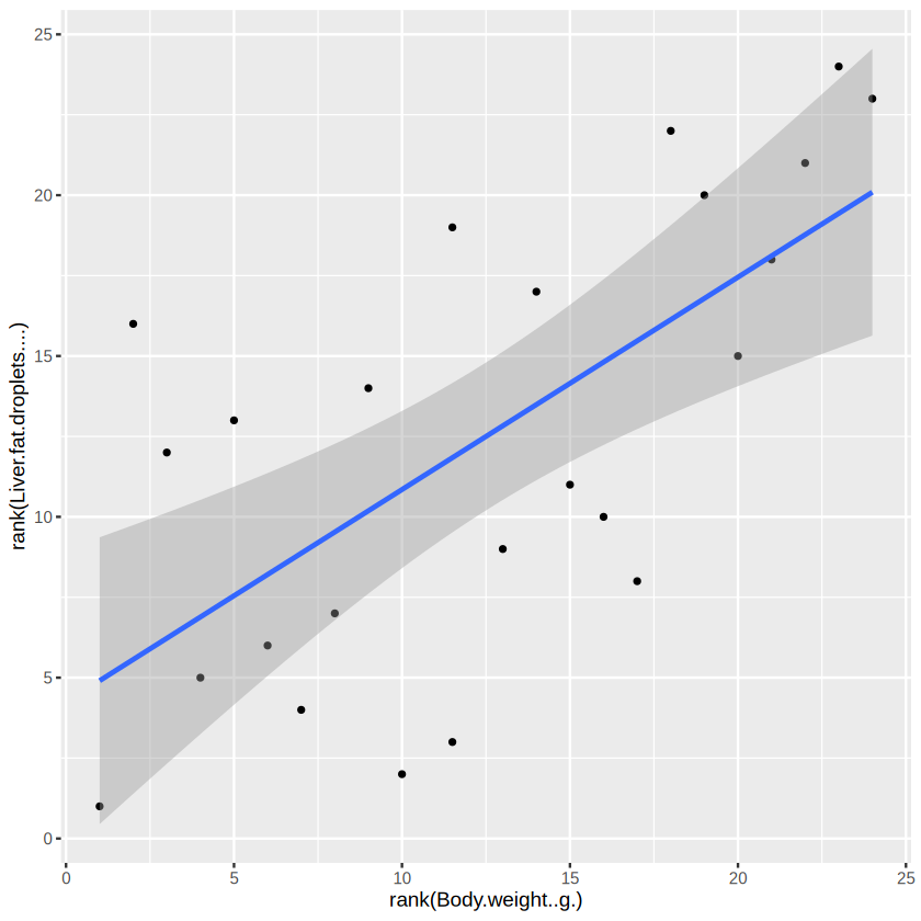 ggplot(data_for_plot, aes(x = rank(Body.weight..g.), y = rank(Liver.fat.droplets.... )) ) + # set the base